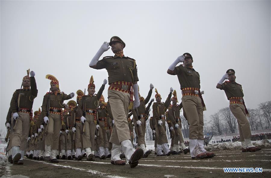 Indian paramilitary troopers take part in a parade during India's Republic Day celebration in Srinagar, summer capital of Indian-controlled Kashmir, Jan. 26, 2017. The local government in Indian-controlled Kashmir on Thursday organized official functions to mark India's 68th Republic Day amid tight security. (Xinhua/Javed Dar)
