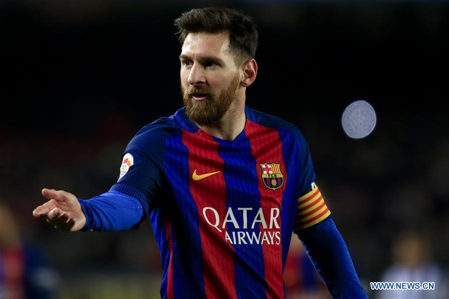 FC Barcelona's Lionel Messi reacts during the Spanish King's Cup quarterfinal football match between FC Barcelona and Real Sociedad at the Camp Nou Stadium in Barcelona, Spain, Jan. 26, 2017. The match ended 5-2. (Xinhua/Pau Barrena)