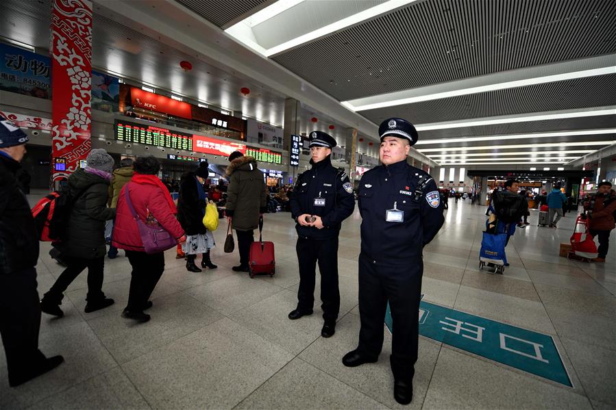 Police officers Gao Yang (C-R) and Nie Yingjie (C-L) stand guard at the Changchun Railway Station during Spring Festial travel rush in northeast China's Jilin Province, Jan. 26, 2017. (Xinhua/Zhang Nan)