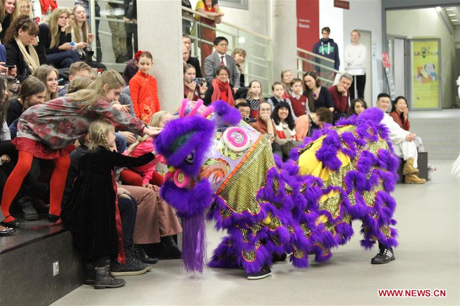 People perform lion dance in a Chinese Lunar New Year celebration event organized by the Confucius Institute of Tallinn University in Tallinn, Estonia, on Jan. 27, 2017. (Xinhua/Guo Chunju)