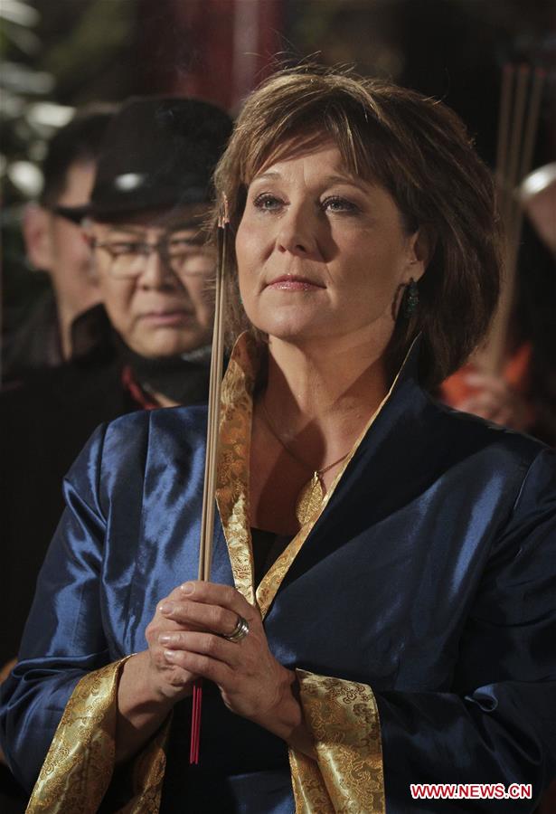 British Columbia Premier Christy Clark prays with incense at a temple to welcome the Chinese Lunar New Year in Richmond, Canada, Jan. 27, 2017. (Xinhua/Liang Sen)
