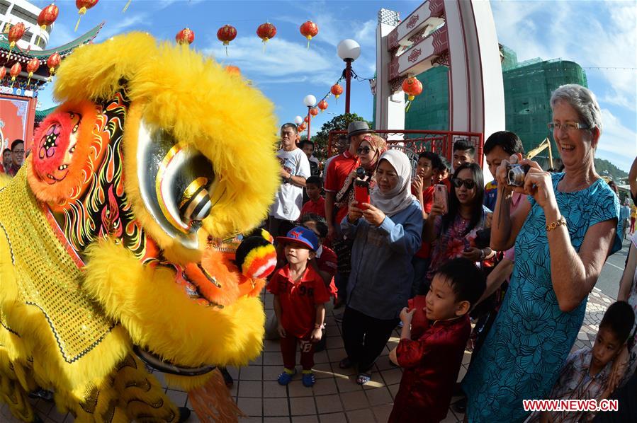 A lion dance performer interacts with onlookers during a celebration marking the Lunar Year of the Rooster in Bandar Seri Begawan, capital of Brunei, Jan. 28, 2017. (Xinhua/Jeffrey Wong)