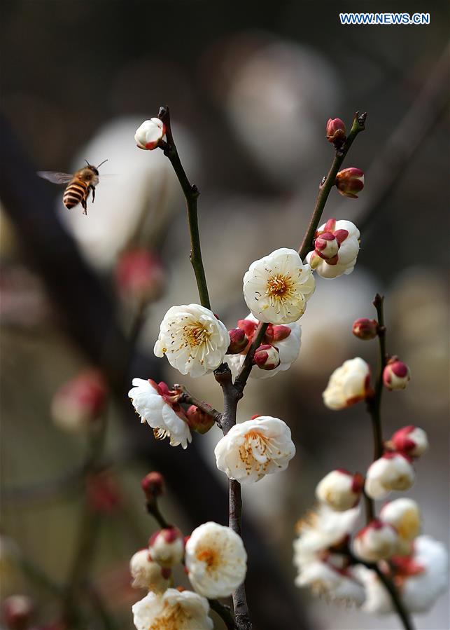 A bee flies amid plum blossoms in Nantong City, east China's Jiangsu Province, Jan. 29, 2017. (Xinhua/Xu Congjun)
