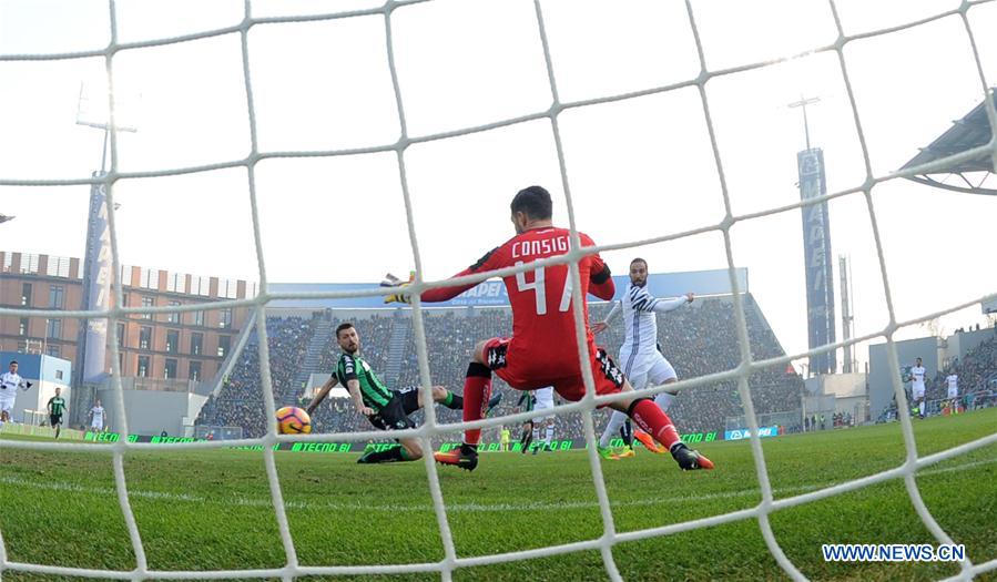 Juventus' Gonzalo Higuain (R) scores a goal during a Serie A soccer match against Sassuolo in Reggio Emilia, Italy, Jan. 29, 2017. Juventus won 2-0. (Xinhua/Alberto Lingria)