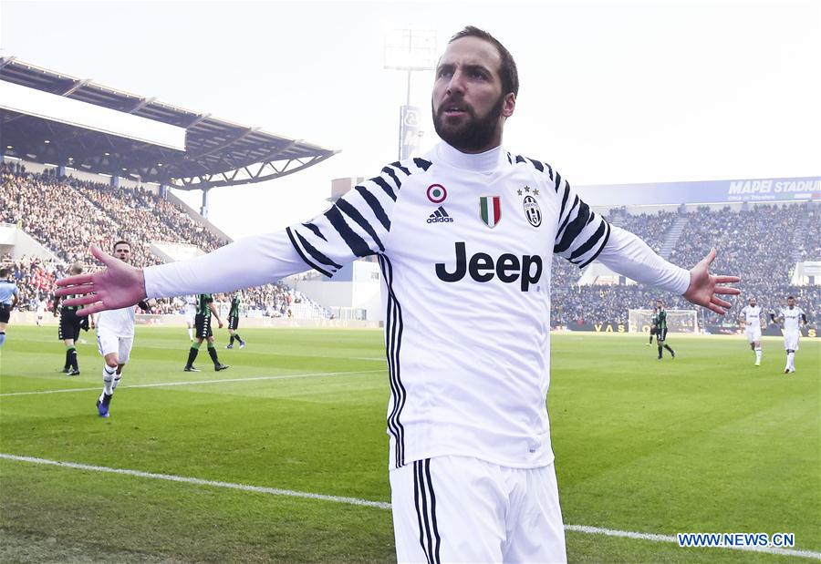 Juventus' Gonzalo Higuain celebrates his goal during a Serie A soccer match against Sassuolo in Reggio Emilia, Italy, Jan. 29, 2017. Juventus won 2-0. (Xinhua/Alberto Lingria)