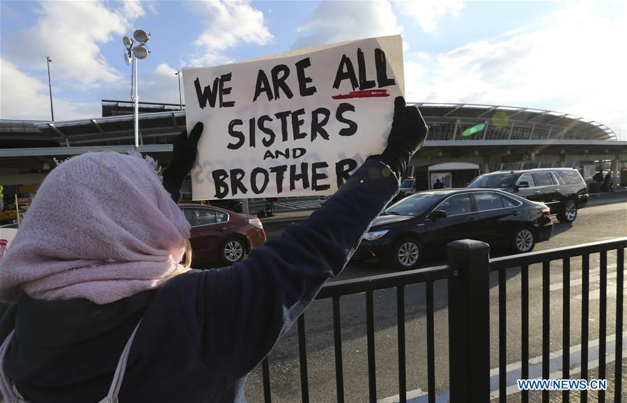 A woman holds a poster during a protest against President Donald Trump's executive order banning entry of citizens from seven Muslim-majority countries, outside the Terminal 4 at John F. Kennedy International Airport in New York, the United States, Jan. 29, 2017. (Xinhua/Wang Ying)