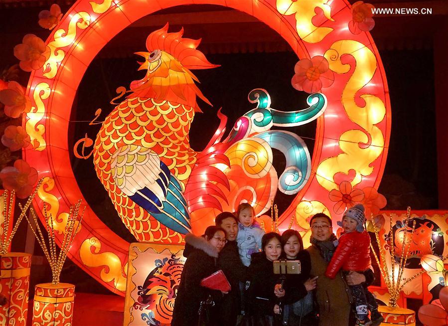 Tourists take photos with the rooster lantern during a lantern fair at Longting park in Kaifeng, central China's Henan Province, Jan. 31, 2017. (Xinhua/Li An)