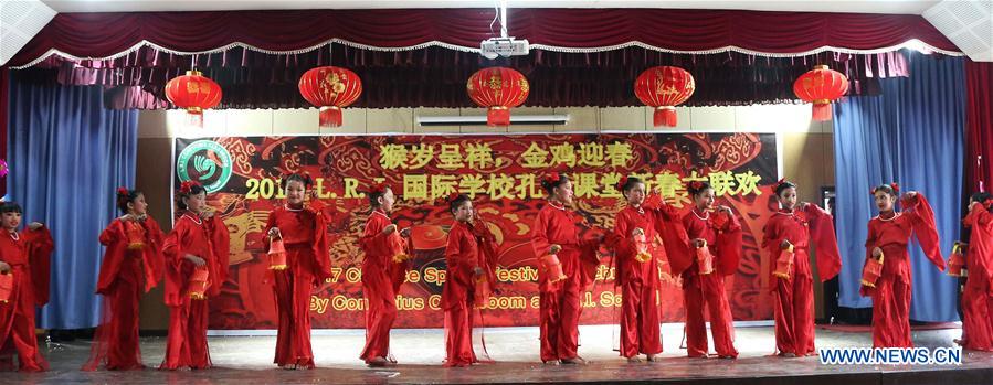 Nepalese students perform a Chinese dance during a program organized by L.R.I Confucius classrooms in the celebration of the Chinese Spring Festival or Lunar New Year in Kathmandu, Nepal, Jan. 31, 2017. (Xinhua/Sunil Sharma)