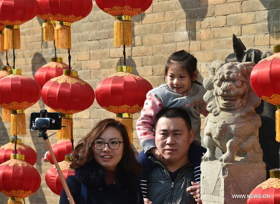 Tourists pose for pictures at the ancient town of Qinglong in Yangqu County in north China's Shanxi Province, Feb. 4, 2017. Folk culture themed temple fair attracted tourists here with its distinctive features. (Xinhua/Cao Yang)