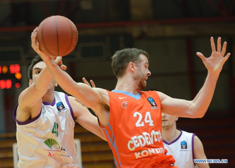 Carlos Suarez (L) of Unicaja Malaga competes against John Shurna of Cedevita Zagreb during their EuroCup Top 16 Group H basketball match in Zagreb, Croatia, Feb. 8, 2017. Cedevita Zagreb won 74-71. (Xinhua/Miso Lisanin)