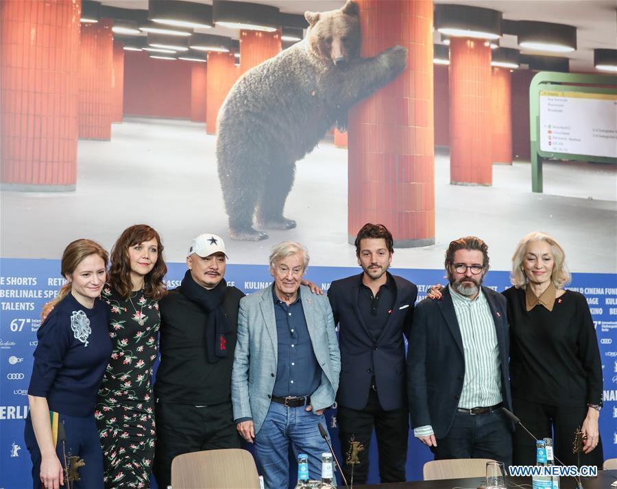President of the jury for the 67th Berlinale International Film Festival, Dutch director Paul Verhoeven (C) and other jury members pose for photo after a press conferecne in Berlin, capital of Germany, on Feb. 9, 2017. (Xinhua/Shan Yuqi)