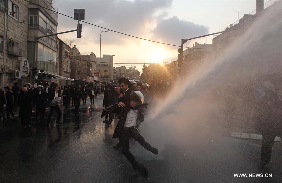 Ultra-Orthodox Jews take part in a protest against Israeli army conscription in an ultra-Orthodox Jewish neighborhood of Jerusalem on Feb. 9, 2017. (Xinhua/Muammar Awad)