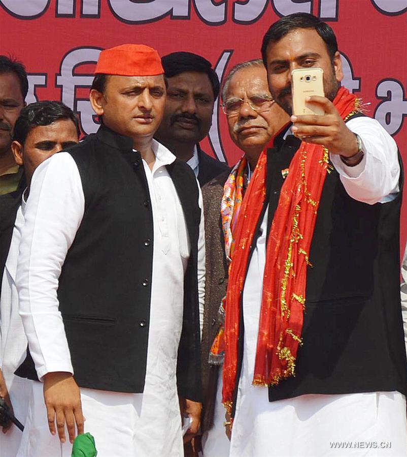 A local leader takes selfie with Uttar Pradesh Chief Minister Akhilesh Yadav (L) during an election rally in Kosikalan near Mathura, northern Indian state of Uttar Pradesh, Feb. 9, 2017. The crucial first phase of polling in Uttar Pradesh for 73 seats has been completed Thursday evening, an election official said. (Xinhua/Stringer)