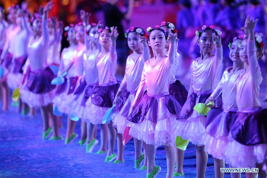 Dancers perform during Chingay parade held on Singapore's F1 Pit Building race track on Feb. 10, 2017. (Xinhua/Then Chih Wey)