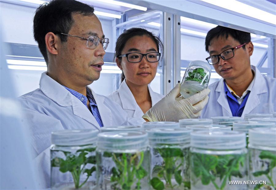 Biology breeding expert Wu Shuiqin (L) and his colleagues check vegetable seedlings at a company in east China's Zhejiang Province, Oct. 23, 2016. Rural per capita disposable income reached 22,866 yuan in 2016, according to Survey Office of the National Bureau of Statistics in Zhejiang. (Xinhua/Tan Jin)