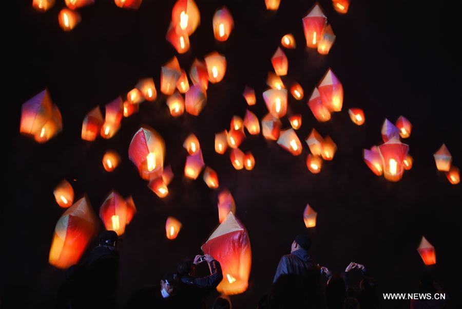 Tourists release sky lanterns to celebrate the Lantern Festival in New Taipei City, southeast China's Taiwan, Feb. 11, 2017. The Pingxi sky lantern festival kicked off here on Saturday. (Xinhua/Ou Dongqu)
