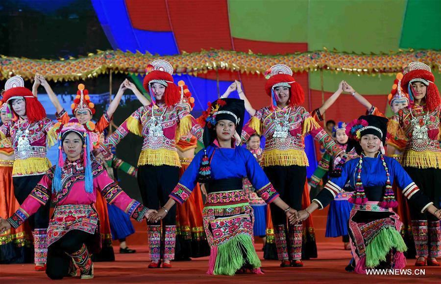 Performers of Yi ethnic group present ethnic clothing at a fashion show in Yongren County, southwest China's Yunnan Province, Feb. 11, 2017. (Xinhua/Yang Zongyou)