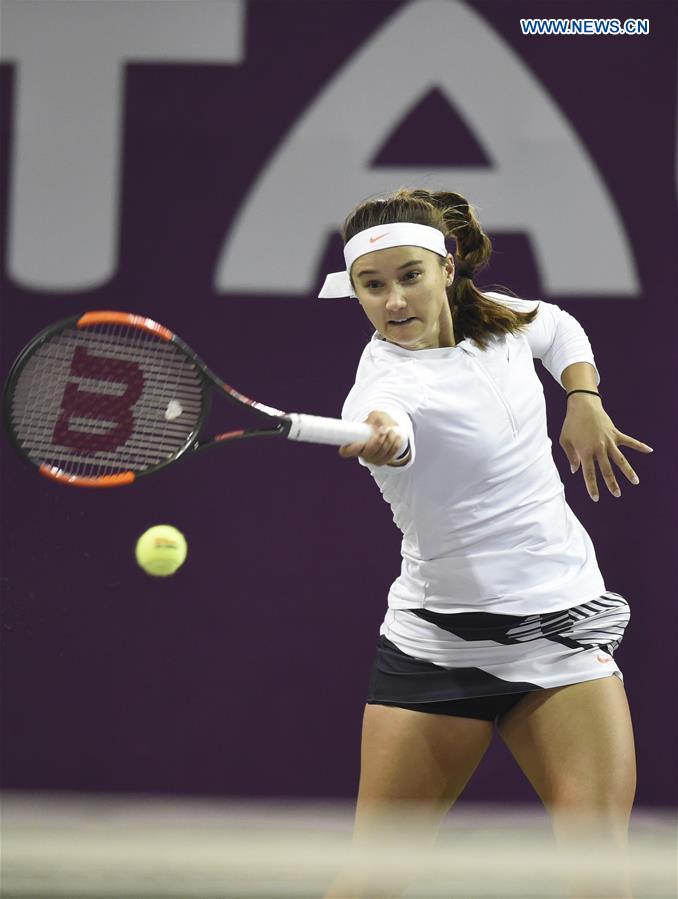 Lauren Davis of United States returns the ball during the women's singles 2nd round qualifying match against Wang Qiang of China at WTA Qatar Open 2017 at the International Khalifa Tennis Complex of Doha, Qatar, Feb. 12, 2017. Lauren Davis won 2-0. (Xinhua/Nikku)