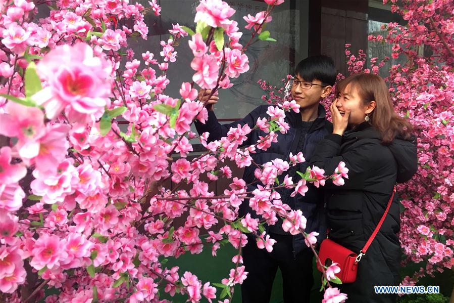 A couple take selfies among peach flowers on the Valentine's Day in Jinan, capital of east China's Shandong Province, Feb. 14, 2017. (Xinhua/Guo Xulei)