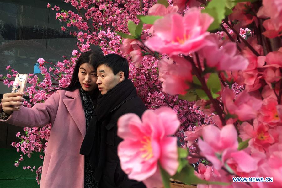 A couple take selfies among peach flowers on the Valentine's Day in Jinan, capital of east China's Shandong Province, Feb. 14, 2017. (Xinhua/Guo Xulei)