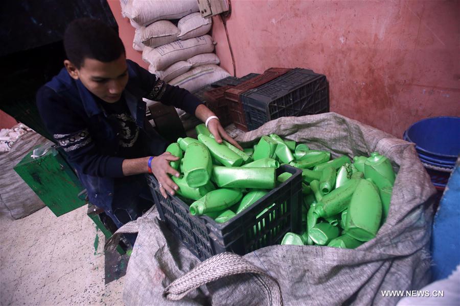 An Egyptian boy works in the School of Recycling in the Zabbaleen district of Monshat Naser, Cairo, Egypt on Jan. 22, 2017. The School of Recycling, located in the Zabbaleen district of Monshat Naser, east Cairo, was built by the Association for the Protection of Environment in cooperation with the United Nations Educational, Scientific and Cultural Organization (UNESCO). Aiming to help the traditionally marginalized group and strengthen environmental protection, the school receives the children of the Zabbaleen (literally meaning garbage collector in Arabic) and teaches them some reading and writing skills, as well as waste management and recycling techniques. (Xinhua/Ahmed Gomaa)