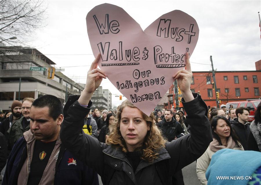 A female participant holds a heart-shaped sign during the Women's Memorial March in Vancouver, Canada, Feb.14, 2017. Thousands of people attend the 27th annual Women's Memorial March to remember women who have died due to physical, mental and emotional violence and to call the public attention about the issue on violence against women.(Xinhua/Liang Sen)