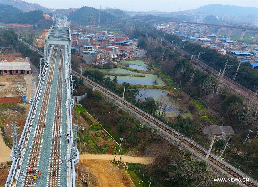 Workers adjust Wuhan-Jiujiang Passenger Railway in Jiujiang, east China's Jiangxi Province, Feb. 15, 2017. The 198-kilometer railway links Wuhan of central China's Hubei Province and Jiujiang of Jiangxi Province. (Xinhua/Hu Guolin)