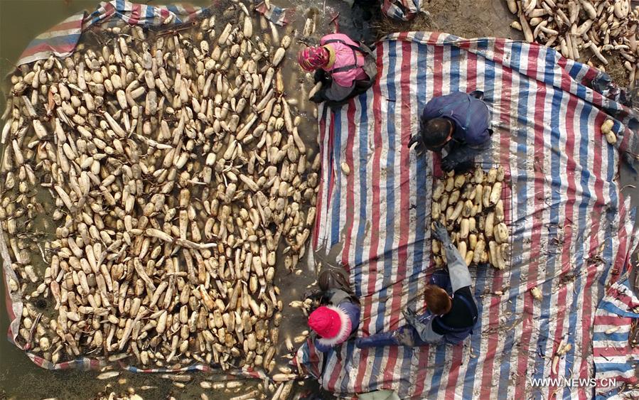 Villagers sort the collected lotus roots in Zhangguo Village of Linyi County, north China's Shanxi Province, Feb. 15, 2017. Local people started the laborious work to collect lotus roots recently as the harvest season came. (Xinhua/Xue Jun)