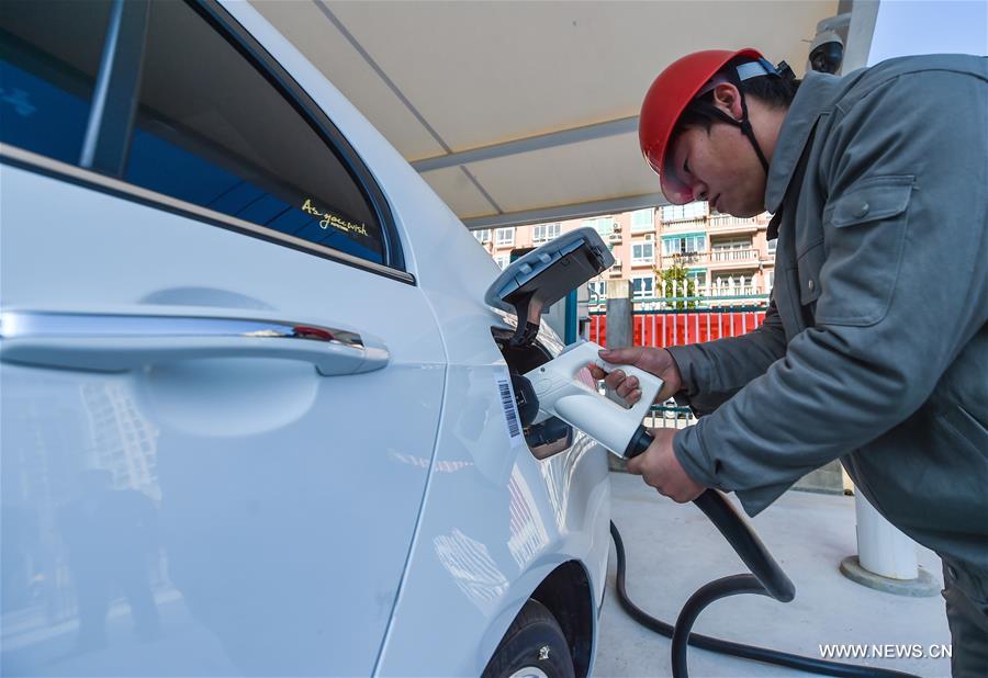 A staff member charges an electric car at a fast charging station in Wenzhou, east China's Zhejiang Province, Feb. 16, 2017. A fast charging station with eight charging piles opened here on Thursday. (Xinhua/Xu Yu)