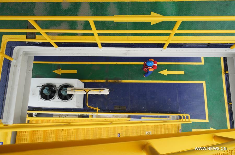 An engineer checks a booster station in Rudong offshore wind farm of China General Nuclear Power Corporation (CGN) in Rudong County of Nantong City, east China's Jiangsu Province, Feb. 16, 2017. The Rudong offshore windpower project, which is located around 25-35 kilometers offshore Yangkou Port, comprises 38 4MW turbines with a total capacity of 152 MW. It is the first wind farm that require offshore wind turbines be installed at areas of at least 10 kilometers offshore and in water depth of at least 10 meters. (Xinhua/Li Xiang)