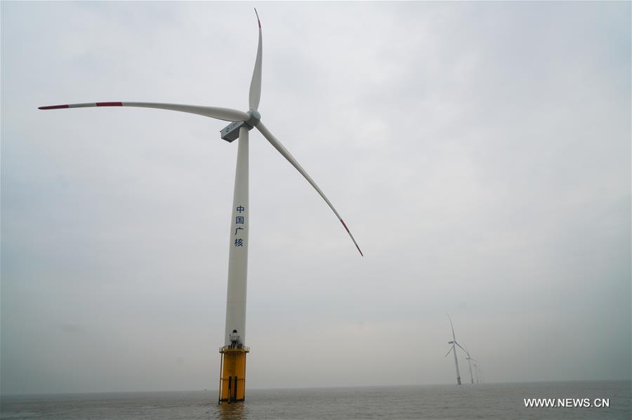 Engineers check a wind power generator in Rudong offshore wind farm of China General Nuclear Power Corporation (CGN) in Rudong County of Nantong City, east China's Jiangsu Province, Feb. 16, 2017. The Rudong offshore windpower project, which is located around 25-35 kilometers offshore Yangkou Port, comprises 38 4MW turbines with a total capacity of 152 MW. It is the first wind farm that require offshore wind turbines be installed at areas of at least 10 kilometers offshore and in water depth of at least 10 meters. (Xinhua/Li Xiang)