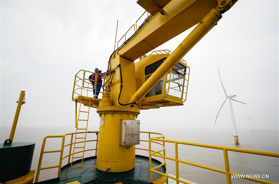 An engineer checks a crane in Rudong offshore wind farm of China General Nuclear Power Corporation (CGN) in Rudong County of Nantong City, east China's Jiangsu Province, Feb. 16, 2017. The Rudong offshore windpower project, which is located around 25-35 kilometers offshore Yangkou Port, comprises 38 4MW turbines with a total capacity of 152 MW. It is the first wind farm that require offshore wind turbines be installed at areas of at least 10 kilometers offshore and in water depth of at least 10 meters. (Xinhua/Li Xiang)