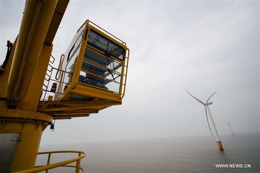 An engineer checks a crane in Rudong offshore wind farm of China General Nuclear Power Corporation (CGN) in Rudong County of Nantong City, east China's Jiangsu Province, Feb. 16, 2017. The Rudong offshore windpower project, which is located around 25-35 kilometers offshore Yangkou Port, comprises 38 4MW turbines with a total capacity of 152 MW. It is the first wind farm that require offshore wind turbines be installed at areas of at least 10 kilometers offshore and in water depth of at least 10 meters. (Xinhua/Li Xiang)