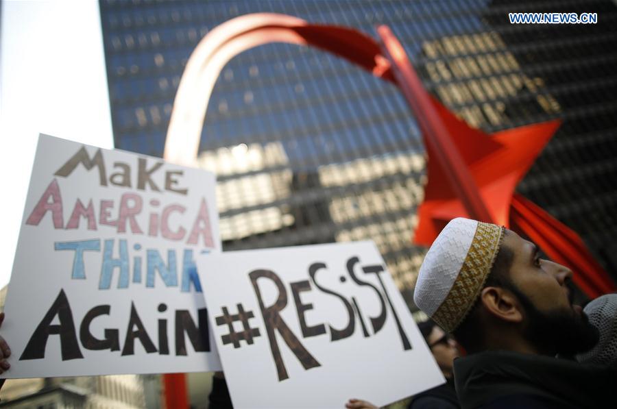 Protesters gather calling for a general strike against U.S. President Donald Trump in Chicago, the United States, on Feb. 17, 2017. (Xinhua/Jim Young)