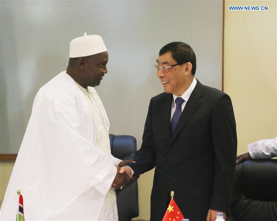 Ma Peihua (R), special envoy of Chinese President Xi Jinping and vice chairman of the National Committee of the Chinese People's Political Consultative Conference (CPPCC), shakes hands with Gambian President Adama Barrow in Banjul, Gambia, Feb. 18, 2017. Ma attended the inauguration ceremony of Gambian President Adama Barrow and Gambia's independence day celebration in Banjul on Feb. 18. (Xinhua)