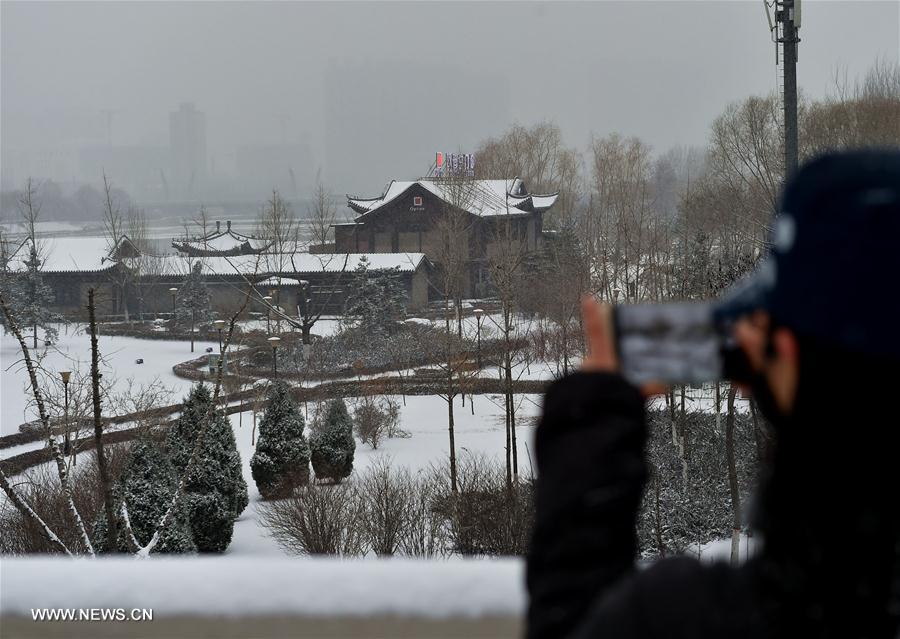 A citizen takes photos during a snowfall in a park at Taiyuan, capital of north China's Shanxi Province, Feb. 21, 2017. Local meteorological center issued yellow alert for heavy snow. (Xinhua/Cao Yang)