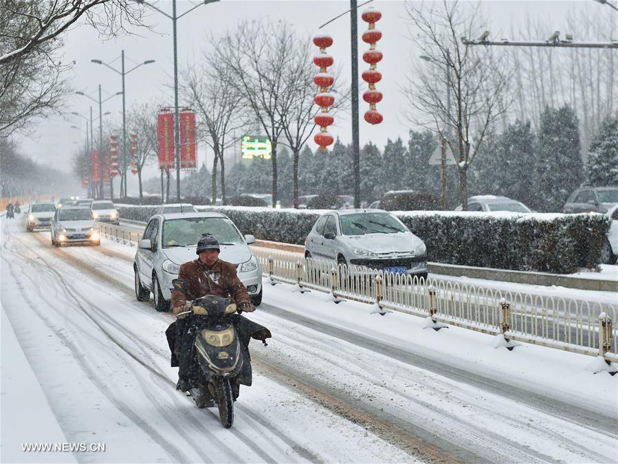 A citizen rides a motorbike on a road during a snowfall at Taiyuan, capital of north China's Shanxi Province, Feb. 21, 2017. Local meteorological center issued yellow alert for heavy snow. (Xinhua/Cao Yang)