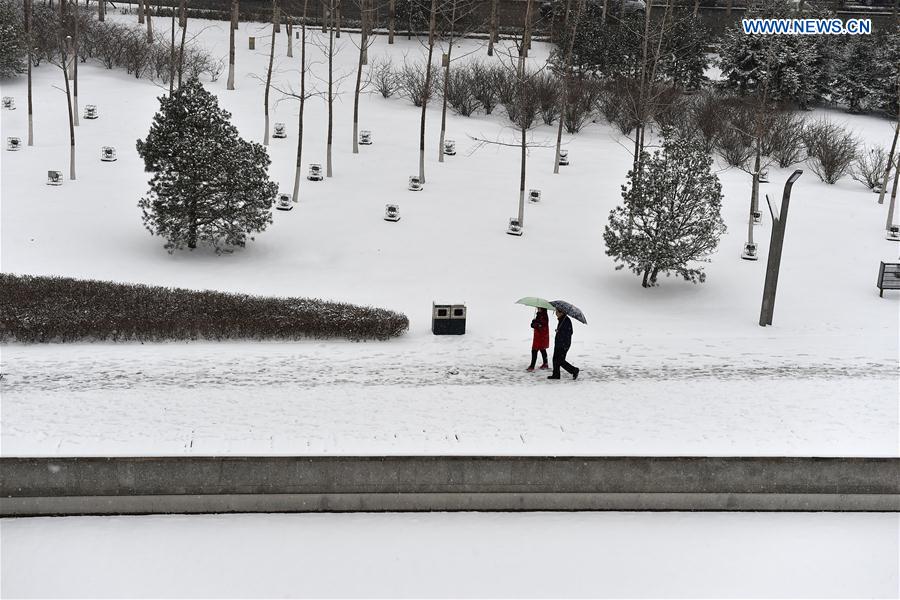 People walk in snow in Taiyuan, capital of north China's Shanxi Province, Feb. 21, 2017. A cold front brought snowfall to many parts of north China. (Xinhua/Zhan Yan)