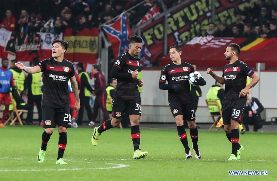 Leverkusen's players celebrate a goal during the first leg match of Round of 16 of European Champions League between Bayer 04 Leverkusen and Atletico Madrid in Leverkusen, Germany, on Feb. 21, 2017. Leverkusen lost 2-4. (Xinhua/Shan Yuqi)