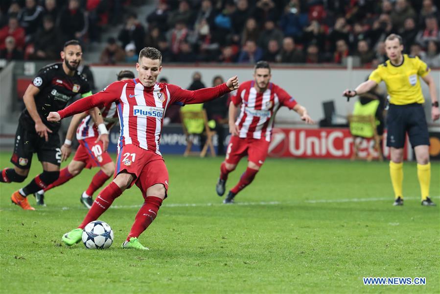 Atletico Madrid's Kevin Gameiro (front) takes a penalty kick during the first leg match of Round of 16 of European Champions League between Bayer 04 Leverkusen and Atletico Madrid in Leverkusen, Germany, on Feb. 21, 2017. Leverkusen lost 2-4. (Xinhua/Shan Yuqi)