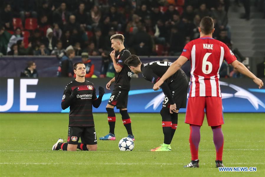 Leverkusen's Javier Hernandez (1st L) prays before the first leg match of Round of 16 of European Champions League between Bayer 04 Leverkusen and Atletico Madrid in Leverkusen, Germany, on Feb. 21, 2017. Leverkusen lost 2-4. (Xinhua/Shan Yuqi)