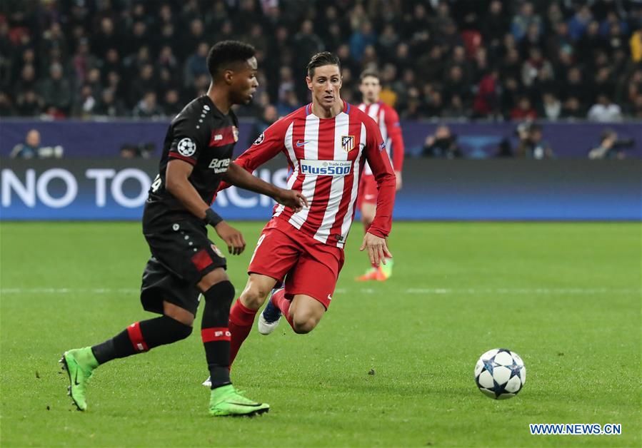Atletico Madrid's Fernando Torres (R) vies with Leverkusen's Wendell during the first leg match of Round of 16 of European Champions League between Bayer 04 Leverkusen and Atletico Madrid in Leverkusen, Germany, on Feb. 21, 2017. Leverkusen lost 2-4. (Xinhua/Shan Yuqi)