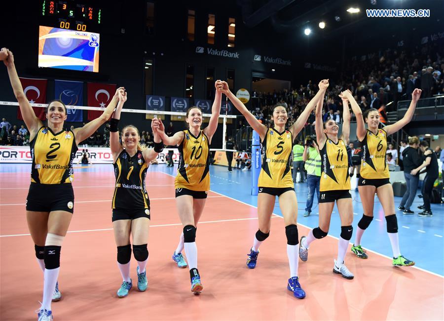 Vakifbank player Zhu Ting (R 3rd) and her teammates greet supporters after CEV Champions League Group D match between Vakifbank and Eczacibasi in Istanbul, Turkey, on Feb. 22, 2017. Vakifbank won 3-1. (Xinhua/He Canling)