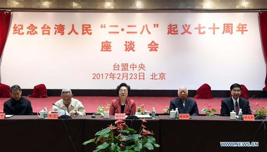 Lin Wenyi (C), vice-chairwoman of the National Committee of the Chinese People's Political Consultative Conference, and also chairwoman of the Central Committee of the Taiwan Democratic Self-Government League (TSL), attends a symposium marking the 70th anniversary of the Feb. 28 Uprising by the Taiwan People in Beijing, capital of China, Feb. 23, 2017. (Xinhua/Chen Yehua)