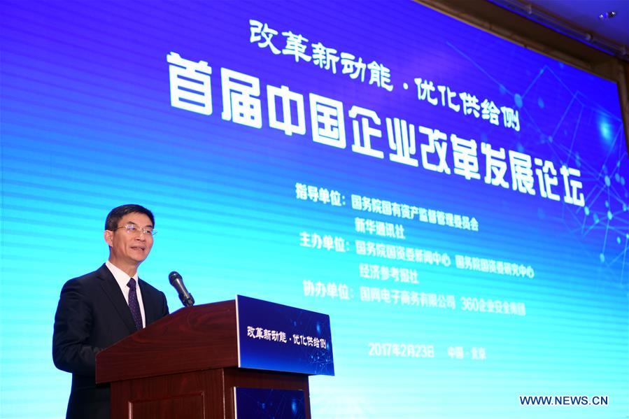 Liu Zhengrong, vice president of Xinhua News Agency, addresses a forum on reform and development of Chinese enterprises in Beijing, capital of China, Feb. 23, 2017. (Xinhua/Jin Liangkuai)