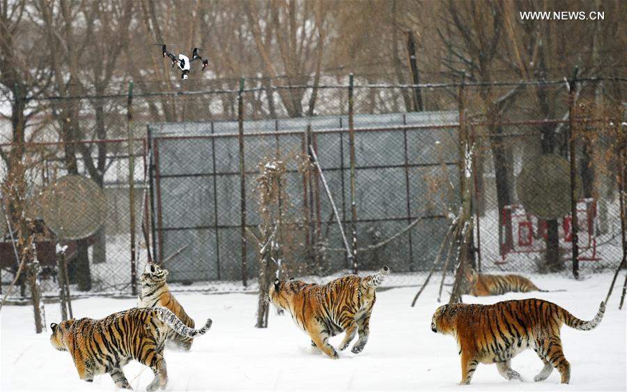 Siberian tigers chase a drone hovering overhead to take aerial photos at the Siberian Tiger Park in Harbin, capital of northeast China's Heilongjiang Province, Feb. 22, 2017. (Xinhua/Wang Jianwei)