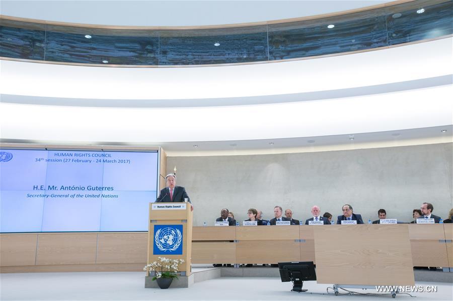 UN Secretary-General Antonio Guterres delivers a speech at the opening of the 34th Human Rights Council (HRC) session in Geneva, Switzerland, Feb. 27, 2017. (Xinhua/Xu Jinquan)