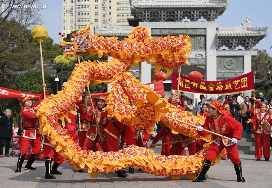 People perform dragon dance in Nanchang, capital of east China's Jiangxi Province, Feb. 27, 2017. Er Yue Er fell on Feb. 27 this year. Chinese people call it the day when the "dragon raises its head", which means the spring awakens after winter hibernation. People usually have their hair cut or hold celebrations to greet the day. (Xinhua/Wan Xiang)