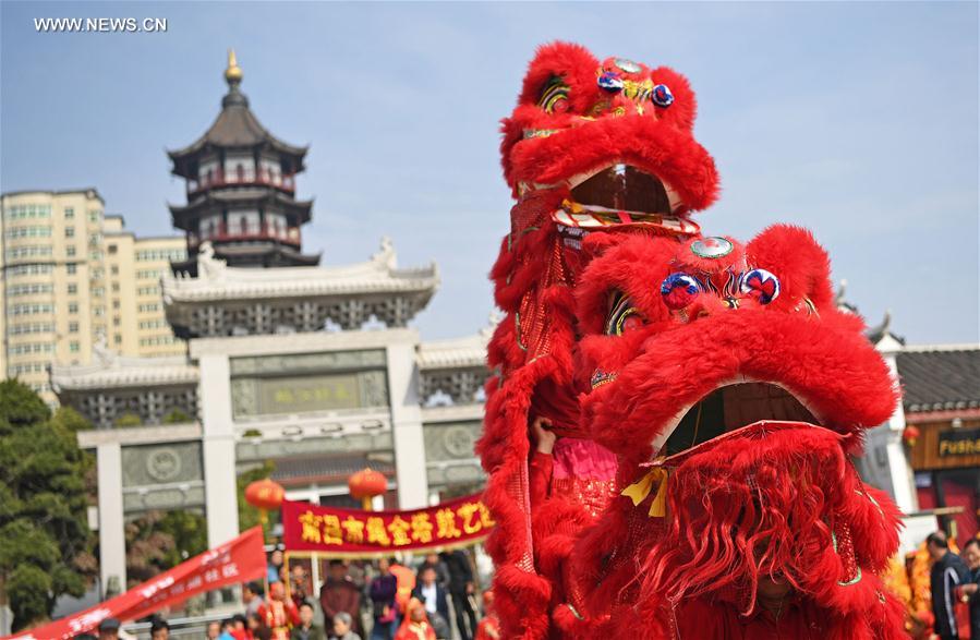 People perform lion dance in Nanchang, capital of east China's Jiangxi Province, Feb. 27, 2017. Er Yue Er fell on Feb. 27 this year. Chinese people call it the day when the "dragon raises its head", which means the spring awakens after winter hibernation. People usually have their hair cut or hold celebrations to greet the day. (Xinhua/Wan Xiang)