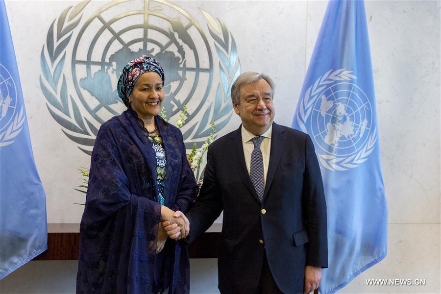 The new deputy UN secretary-general Amina Mohammed (L) shakes hands with UN Secretary-General Antonio Guterres after she took the oath of office at the UN headquarters in New York, on Feb. 28, 2017. The new deputy UN secretary-general Amina Mohammed formally took office on Tuesday. (Xinhua/Li Muzi)